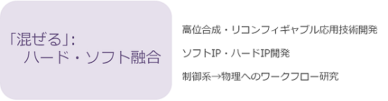 従来の手法によって、ソフトウェアを拡張していくと、その拡張に追随できないプラットフォームは簡単に破綻してしまいます。しかし、この「混ぜる」の技術により、ハードウェアをソフトウェア化し、ソフトウェアの負荷を高速な並列プロセッサで分散化します。ソフトウェアは構造化されたまま、余裕を持った拡張が可能になります。また、ソフトウェアIPおよびハードウェアIPの開発もあわせて行います。